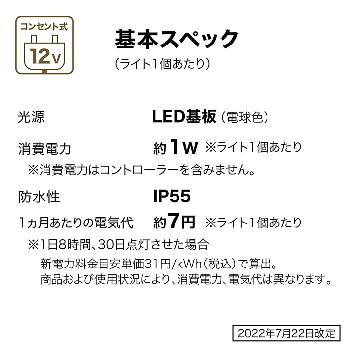 | 備考 | [使用環境]屋外[LED色]電球色(2700K)[LED数]1球/1台あたり [電圧]12V[消費電力]約1W/1台あたり ひかりノベーションシリーズの専用コントローラーへの接続可能 [防水性]IP55 [組立必要人数]1人[本体組立時間]20分未満 1年保証 |